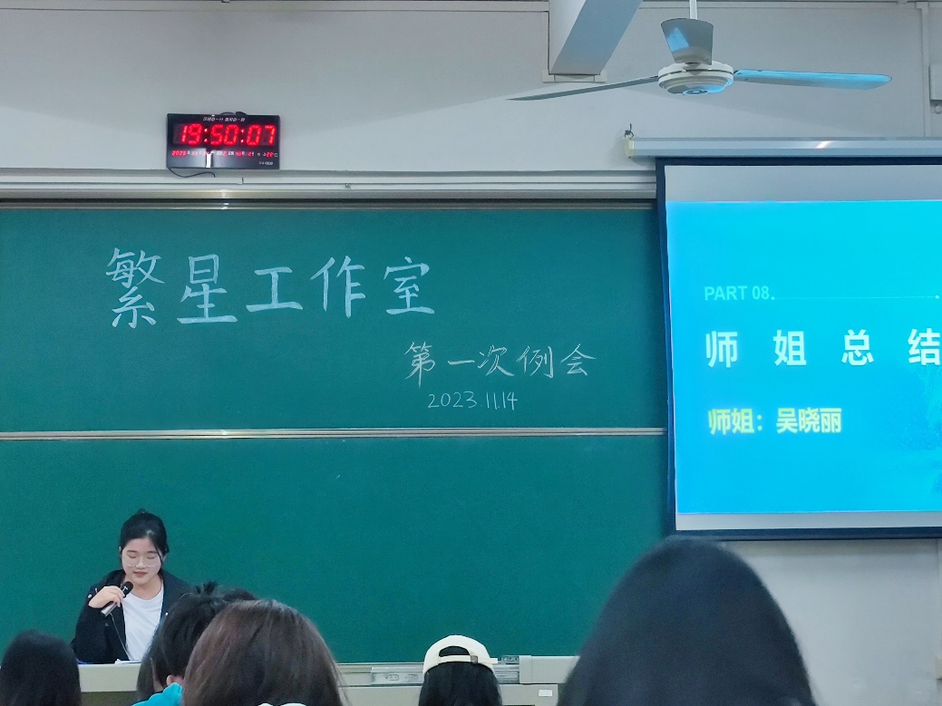 接下来是繁星工作室上任会长吴晓丽师姐对此次例会进行总结,吴晓丽师姐分享了一些经验,建议大家积极参与繁星工作室协会的活动和实践,还希望同学们能够注重个人成长和发展,最后祝愿繁星的所有成员能在繁星工作室获得成长和发展的机会,度过一段难忘的时光。