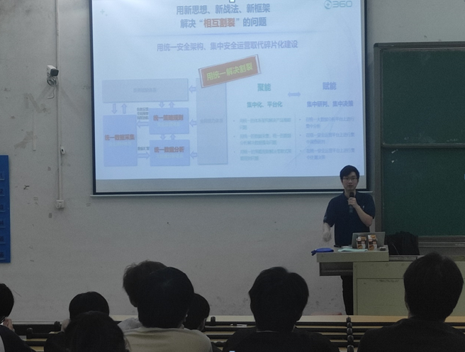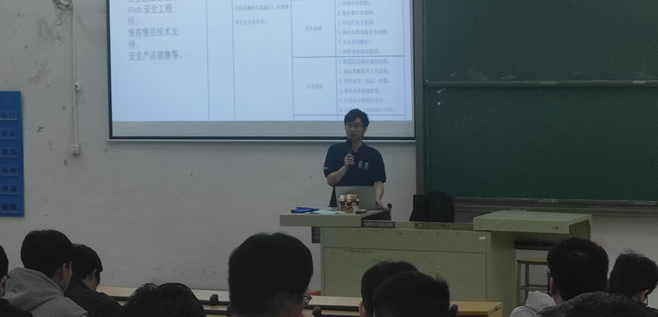 【本网讯】了解网络行业技术发展对帮助大学生明确学习目标、树立正确学习观念、形成良好学习习惯有着关键性的影响,对促进学风建设也发挥着重要作用。为帮助2023级本科毕业生明确网络安全的发展形势与就业方向,以引导学生科学合理地筹划网络安全专业的就业方向,2023年11月30日,网络工程教研室邀请学院校企合作单位专家进校开展就业专题系列讲座。本次讲座邀请了奇虎360公司高级网络安全攻防专家沈德,专题讲座由网络工程教研室刘杜奎老师主持,网络工程专业2020级B1、B2班本科生和23级网络工程B1班本科生参加。