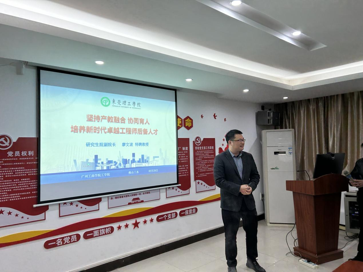 【本网讯】为推进职业教育校与校、校与企业之间的交流合作,推动产教融合深入发展,加快培养高素质、高技能实用型人才,打造纵向贯通、横向融通的现代职业教育体系,2月29日下午,我院举办了“坚持产教融合协同育人,培养新时代卓越工程师后备人才”专题讲座。我院特邀东莞理工学院研究生院廖文波副院长进行主讲,我院副院长欧仕益、罗俊出席,各教研室主任等相关人员参加。