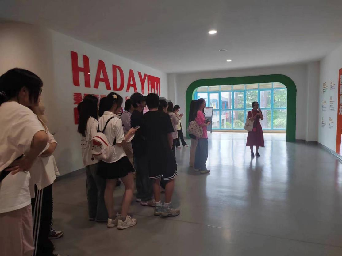 然后,海天讲解员把同学们分批带进“酱园古风”,给同学们讲解了海天品牌的由来、产品的优势和产品类型,其中有一条呈现古代酱油酿造过程的通道,在这条通道上同学们能够全程看到古代酱油生产的整个过程-从黄豆、到成品、再到杂货店出售的过程,深入了解古时酱油工艺的制作。同时,同学们观看了海天酱油的宣传片,让同学们对海天产品有了进一步的认识。随后,在讲解员的带领下,通过3D影院、4D绘画等让同学们了解了酱油酿造的发展史及产品类型。在工厂走廊,同学们透过玻璃窗,看到了酱油生产的实时生产场景,对酱油的生产到包装成品及样品检测一览无余。同学们对每小时可产52000瓶的自动化生产线和储存3.5万吨酱油的无人仓库-海天酱油的全自动化生产技术赞叹不已。紧接着,在讲解员的带领下,同学们参观了厂区内规模最大的阳光天然晒池、发酵大罐,完成了长达3公里空中走廊的行走,近距离体验海天味业的宏伟景观。参观后,同学们品尝了海天的最新产品-苹果味饮料、冰淇淋和麻薯等,同学们都赞不绝口,了解了海天的高科技技术。