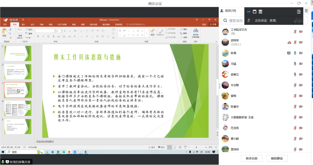 会议伊始,各教研室依次进行期末材料工作汇报,分别阐述了教学资料、期末资料、毕设材料的收集、整理、归档的方法和流程。