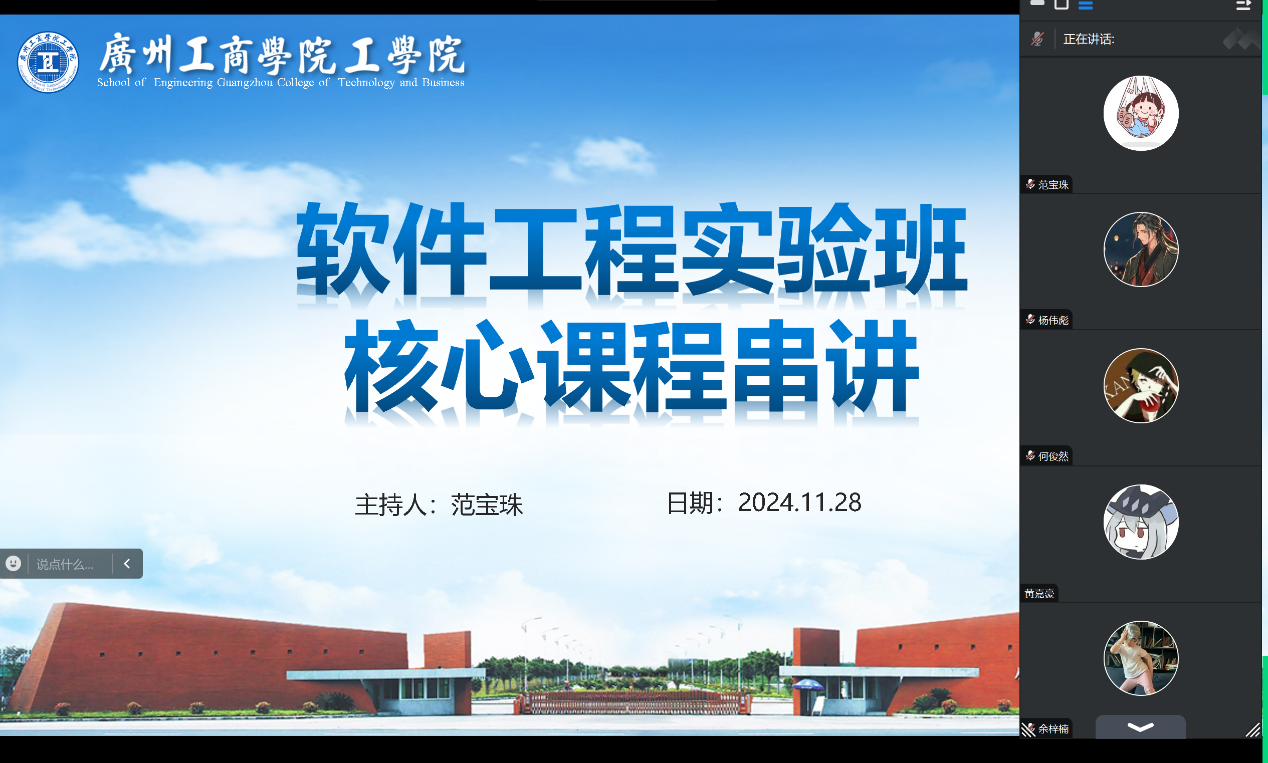 在第12周的串讲中,冯猛老师通过线上会议为学生带来了的数据结构与算法课程,以典型算法的讲解和分析为核心,帮助学生深刻理解数据结构设计思想。范宝珠老师主讲的数据库原理与应用课程,重点讲解关系型数据库的核心原理、应用领域及学习方法,帮助学生了解数据库基础。朱文彬老师的高级网页设计课程则深入探讨网页设计的前沿技术,涵盖交互设计与美学融合的实际应用,为学生拓展实践视野。汤杏华老师主讲的软件工程导论课程,从软件开发生命周期的理论与实践出发,帮助学生系统化理解软件工程基础框架。徐永哲老师的JavaScript应用技术课程梳理了JavaScript核心技能,包括事件处理、DOM操作和前端框架应用,注重实用性与创新性的结合。