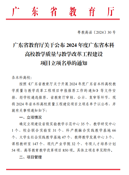 【本网讯】日前省教育厅公布了2024年省级质量工程项立项名单(粤教高函[2024]30号),工学院申报的2个项目位列其中。院长张永平教授牵头申报的“数智技术产业学院”成功立项,这是ky开元获批的第2个省级现代产业学院。同时,学院宋钰老师申报的高等教育改革项目也获批立项。