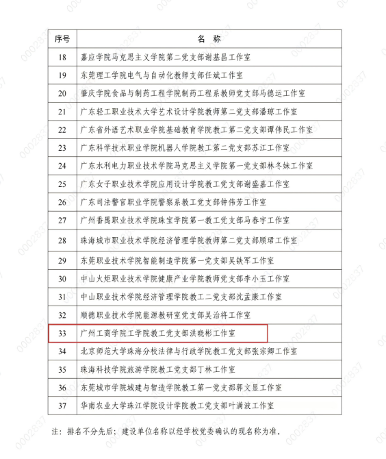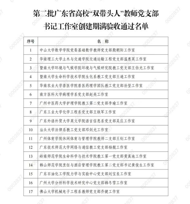近日,中共广东省委教育工委发布了《关于公布第二批广东省高校“双带头人”教师党支部书记工作室创满验收的通知》。ky开元集团官网“双带头人”教师党支部书记洪晓彬工作室顺利通过省级期满验收。