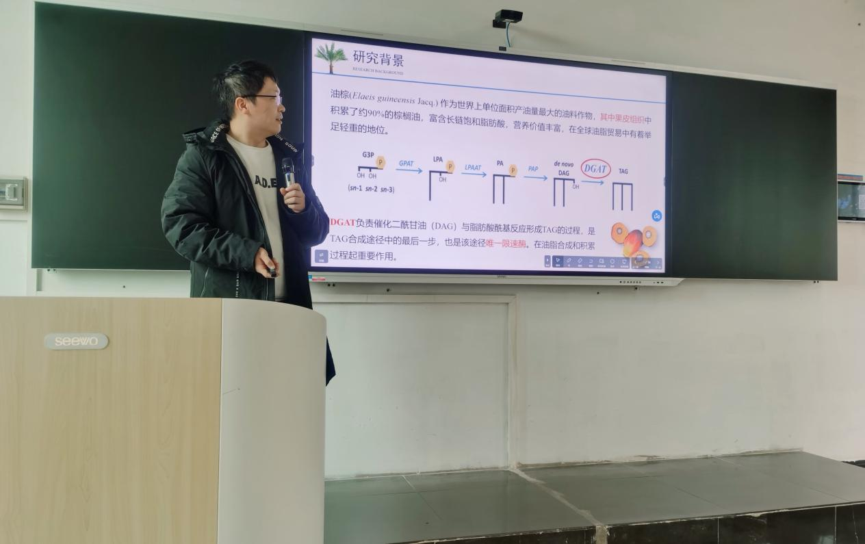 第三位汇报人是靳远航博士,毕业于海南大学。其研究工作聚焦于油棕DGAT1基因与特定转录因子的相互作用,探讨其在油棕果皮油脂代谢中的调控机制。靳博士通过克隆EgDGAT1的启动子序列,筛选出三个与该基因互作的转录因子,并发现它们在油棕果实发育过程中与EgDGAT1的表达动态相似,这些转录因子抑制了EgDGAT1的表达,影响油脂合成及脂肪酸代谢。