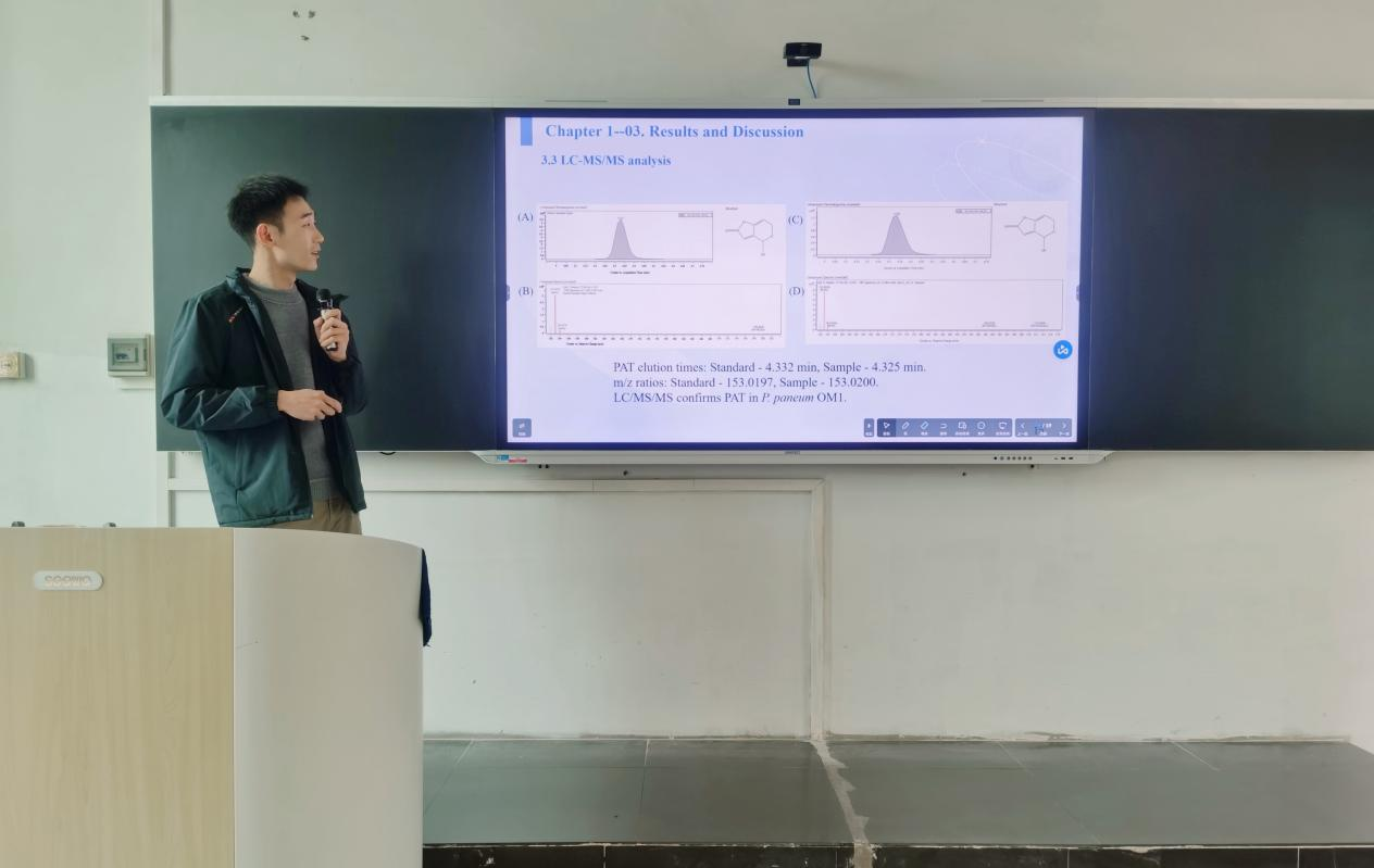 第二位汇报人是赵文才博士,韩国汉阳大学食品营养专业毕业。赵博士的博士研究聚焦食品微生物学,特别是在食品毒性和食品卫生领域。他从梨中发现了一株产展青霉素的新菌株,并进行了为期两年的基础理化研究和全基因测序分析,将测序数据上传至NCBI国家数据库。赵博士的研究不仅增进了对食品微生物学的理解,也为食品安全提供了新的视角。