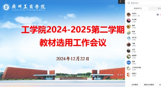 【本网讯】2024年12月22日中午19时,工学院以腾讯会议线上会议的形式,召开了2024-2025第二学期教材选用工作会议,全体教研室主任参加,会议由胡垂立副院长主持。