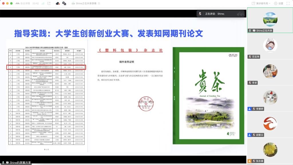 本次分享会由工学院胡垂立副院长主持,五位导师依次发言。李卓老师以“与学生一起乘风破浪”为主题,分享了他带学生的四大经验:鼓励式教育、不放弃任何一名学生、启发学生自主思考和鼓励学生积极参加活动。在他的悉心指导下,两名学生荣获蓝桥杯广东省三等奖,成功开展两个大创项目并发表多篇论文。他强调,作为学业导师,要与学生建立良好的师生关系,相互学习,共同成长。