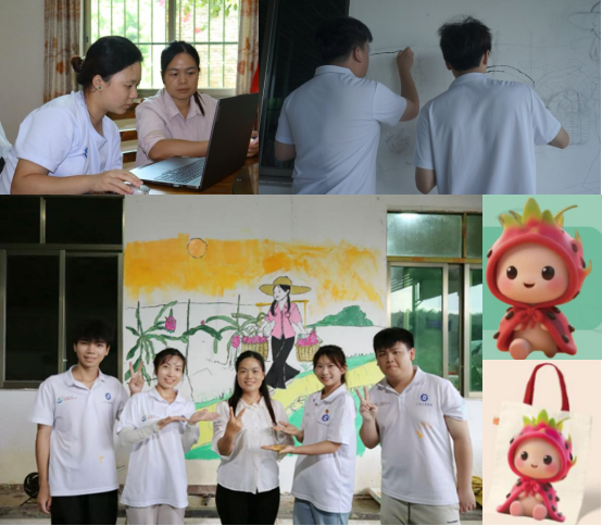 团队应云浮市盈科生态农业科技有限公司负责人陈汉英女士邀请,以企业外墙为载体,创作墙绘,将火龙果采摘、花晾晒、成品封装等八道工序艺术化呈现;同期,专属IP“盈小果”定稿,配套表情包、马克杯、帆布袋等文创也将