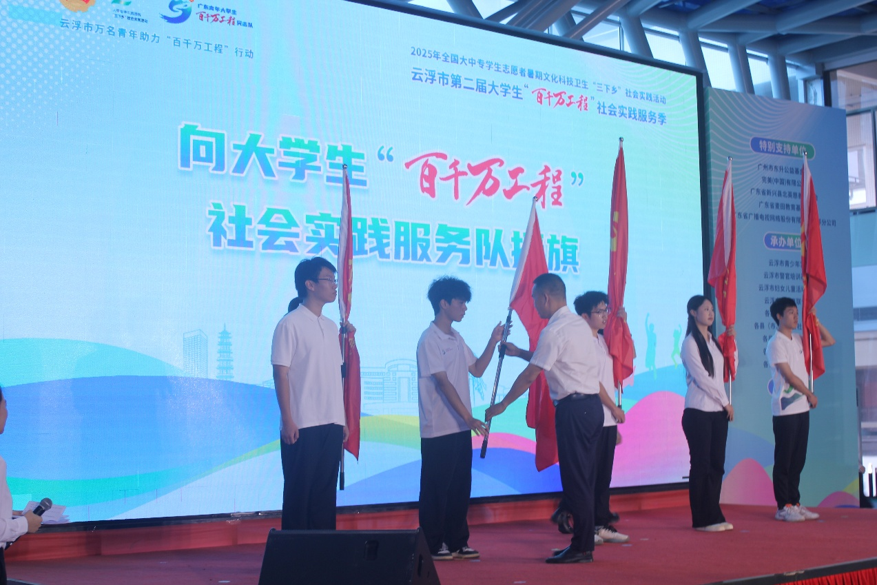团云浮市委举办的大学生暑期社会实践活动暨云浮市第二届大学生社会实践服务季启动仪式上,24食品超越B1班作为来云高校突击队代表接旗。适逢云浮筹备第十五届全国运动会,青春力量与城市发展的交汇,为本次实践赋予更深远的时代意义。