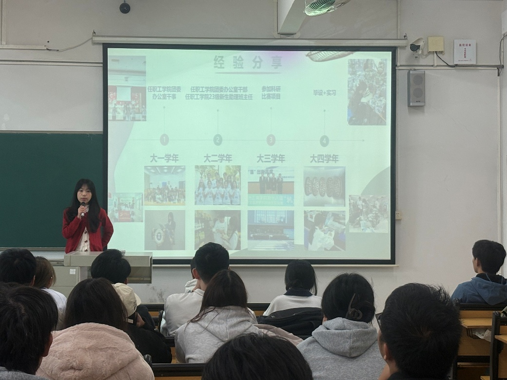 随后由两位在学业、科研或社会实践方面表现突出的高年级学长学姐分享经验。梁思颖同学详细介绍了大学四年可以参加的项目、竞赛及考证的类型与时间,鼓励新生积极参与各种社团活动,提升自己的综合素质;唐永祥同学结合自身经历,从“如何高效学习专业课程”、“如何参与实验室科研项目”到“如何平衡学习与社团活动”,分享了宝贵的心得与实用技巧。学长学姐们风趣幽默、真诚恳切的讲述,引起了在场新生的强烈共鸣。这种“朋辈引领”的方式,极大地消除了新生们对未来的迷茫与焦虑,树立了可见、可学的榜样。