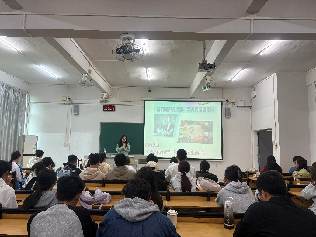 【本网讯】为使2025级新生深入了解专业内涵、明确学习目标、科学规划大学生涯,2025年10月23日,工学院食品营养与检验教育专业为2025级新生们举办了一场内容丰富、意义深远的入学教育活动。本次活动由教研室主任李瑞婷副教授主持,优秀学长学姐代表及专业教师代表齐聚一堂,以“专业领航、榜样引路、成长赋能”为主线,通过专业主任定方向、优秀学长学姐传经验、专业教师授方法的“三维互动”形式,为新生打造了一场兼具专业性与实用性的“开学第一课。