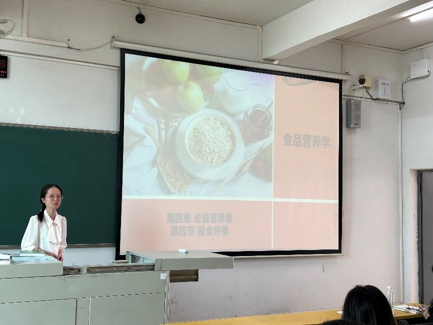 郑茗老师讲授的内容选自课程第四章第四节膳食纤维。授课过程中,郑老师通过回答上节课学生的课后提问自然导入本节课的教学内容,引用生活中糖尿病防治等案例,带领学生去思考膳食纤维的分类和功能,从而实现新课讲授。评委老师充分肯定其扎实的专业知识基础和良好的教学能力,但也建议通过丰富教学课件元素,增加更多与学生的互动环节以获得更好的教学效果。