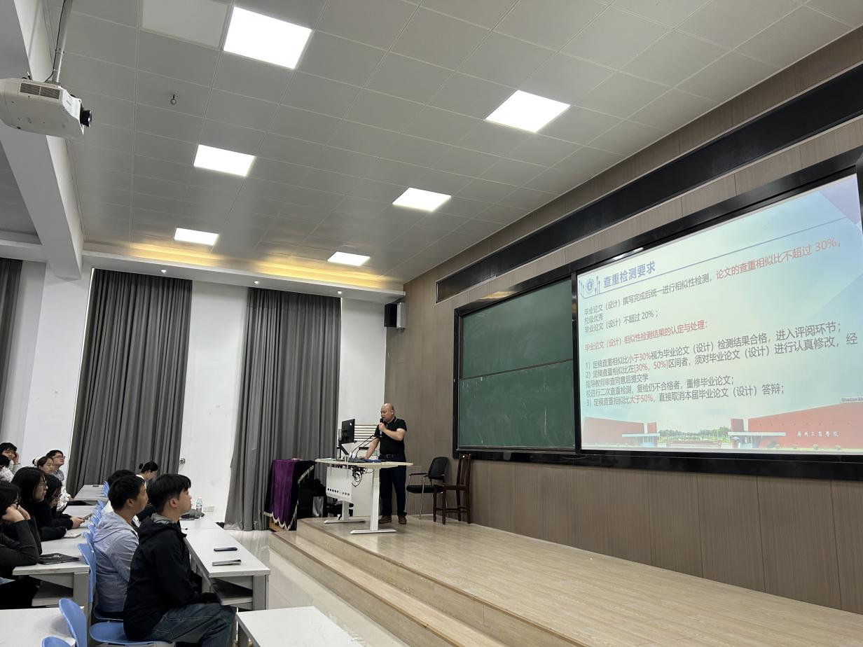 在毕业论文(设计)动员环节中,曾主任发表讲话。他指出,毕业论文(设计)不仅是对学生四年学业的全面总结,更是对学生综合应用能力与创新精神的深入考验。曾主任详细介绍了毕业论文(设计)的基本要求和工作计划,强调了从选题、研究过程到成果汇报的关键环节,并为学生讲解了论文答辩及成绩评定标准。他希望同学们严格按照计划按部就班地推进任务,在研究中培养创新思维和解决问题的能力。