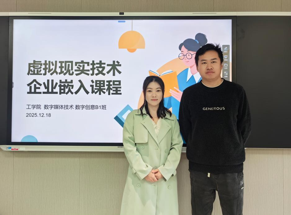 【本网讯】为深化产教融合,将前沿产业技术动态与真实项目实践流程引入校园,近日,工学院数字媒体技术专业与上海琨耀信息科技有限公司成功合作,举办了为期两天的“虚拟现实企业嵌入实训课程”。本次实训于2025年12月18日至19日在学院的虚拟现实实验室进行,以“虚拟现实技术与创新应用”为主题,特邀企业资深MR技术专家唐长超先生主讲。作为该班级的班主任及《虚拟现实技术》与《虚拟现实创新作品展》两门课程的负责教师,宋悦老师全程组织并陪同参与,带领2023级数字媒体创意B1班的同学们共同经历了一场集技术实战、行业洞察与未来展望于一体的沉浸式学习体验。