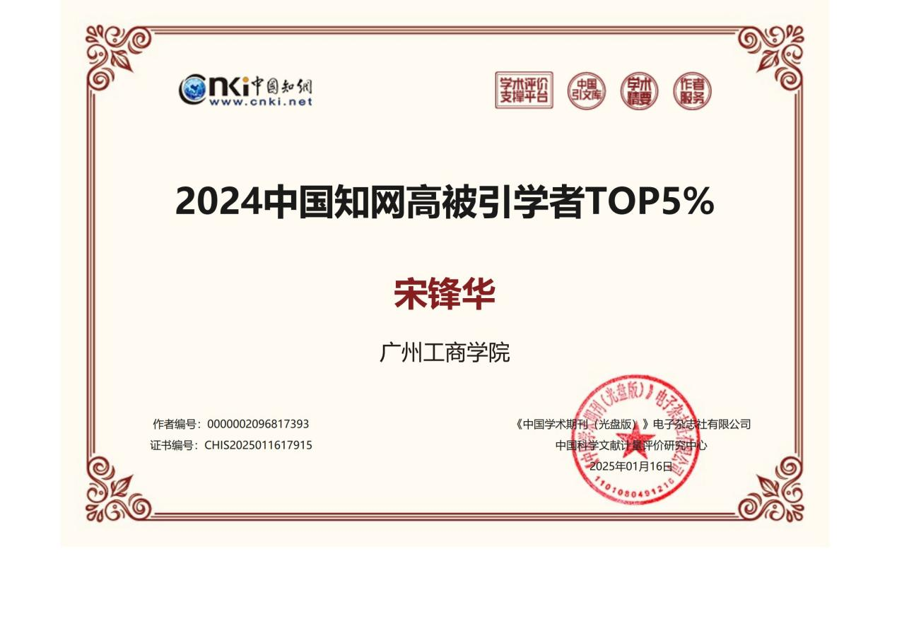 【本网讯】近日,中国知网中国科学文献计量评价研究中心(简称“知网评价中心”)基于中国知网收录的国内学术期刊论文和会议论文,2024年首次开展学者学术影响力客观评价,遴选了“2024中国知网高被引学者”名单,我院宋锋华教授上榜。