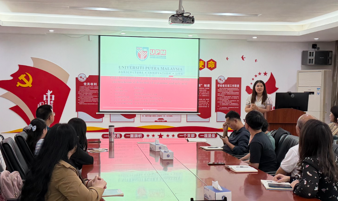 第二位汇报人周凤博士以《Au@MOF材料的合成及其对多巴胺与尿酸的电化学同时检测》为主题,介绍了其在生物传感材料方面的最新研究进展。周老师从多巴胺与尿酸的生理意义入手,阐述了同时检测这两种物质在神经疾病诊断与代谢监测中的重要性,并详细讲解了Au@MOF复合材料的合成方法及其在电化学检测中的优异性能,展示了该材料在快速、高灵敏度生物检测中的应用潜力。汇报结束后,与会教师围绕汇报内容展开了热烈讨论,就材料合成路径、检测灵敏度、实际应用场景等问题进行了深入交流。