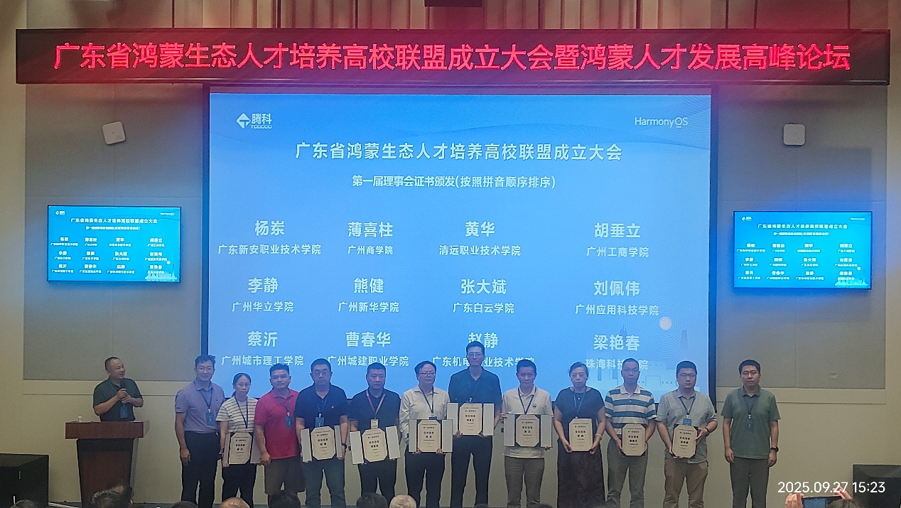 【本网讯】2025年9月27日,“广东省鸿蒙生态人才培养高校联盟成立大会暨鸿蒙人才发展高峰论坛”在东莞华为松山湖基地隆重举行。本次会议由广东省计算机学会、广东省数智科技研究会联合主办,中山大学软件工程学院、华南理工大学软件学院、广州腾科网络技术有限公司共同承办。来自全省高校、企业的近300余名专家学者齐聚一堂,共同见证广东省鸿蒙生态人才培养高校联盟(以下简称联盟)成立,探讨鸿蒙生态人才培养新路径。ky开元集团官网工学院胡垂立副院长受邀参加了会议。