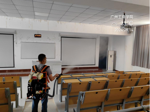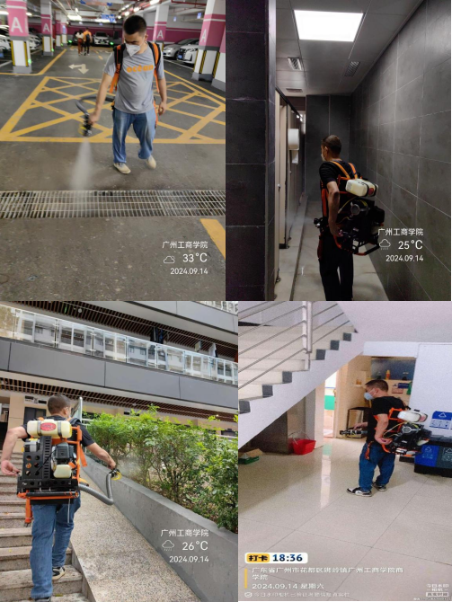 2.专业消杀与药物喷洒。外请敏信虫害专业消杀队伍,采用超低容量喷雾、烟雾器烟熏、滞留喷洒等多种方式,对全校重点场所和区域进行全方位、无死角的蚊虫消杀。针对下水道、花基草坪、各大楼宇、足球场等易滋生蚊虫的区域,采用喷雾机进行药物喷洒,确保灭蚊效果。