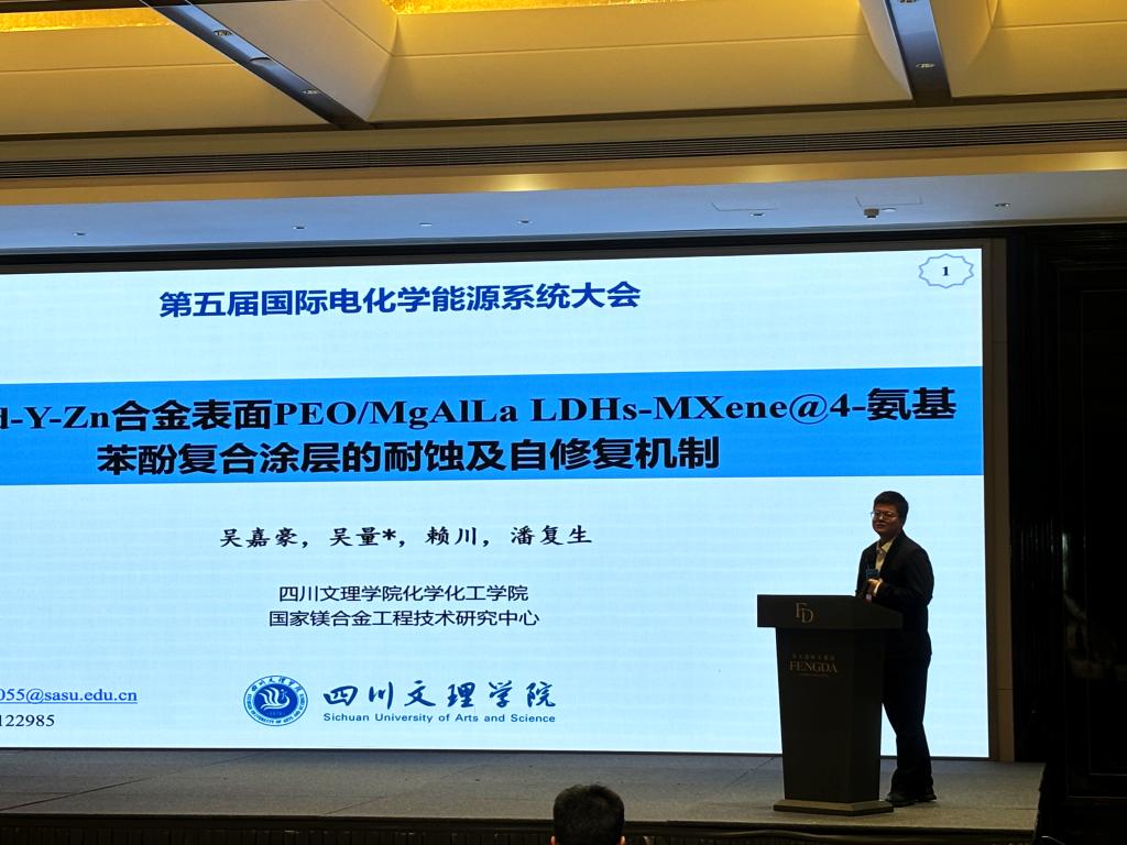 本次大会由东南大学、国际储能材料学会、上海交通大学绍兴新能源与分子工程研究院、北京化工大学化学学院等29家单位主办,由东南大学能源与环境学院、北京理工大学长三角研究院(嘉兴)、湖南文理学院、江苏理工学院、长春理工大学材料科学与工程学院和四川文理学院LETOU国际米兰官网承办和协办。重庆大学潘复生院士向大会致辞,杨裕生院士、成会明院士、俞书宏院士、Prof.0liver G.Schmid 院士、Prof.Ho Seok Park院士等出席大会并做主旨报告。其中,吴嘉豪博士代表四川文理学院LETOU国际米兰官网在会议上做了题为“Mg-Gd-Y-Zn合金表面PEO/MgAlLa LDHs-MXene@4-氨基苯酚复合涂层的耐蚀及自修复机制”的报告,为涂层的电化学腐蚀测试和微区电化学技术的功能应用提出了创新性思路,获得了与会同行和专家的高度评价。