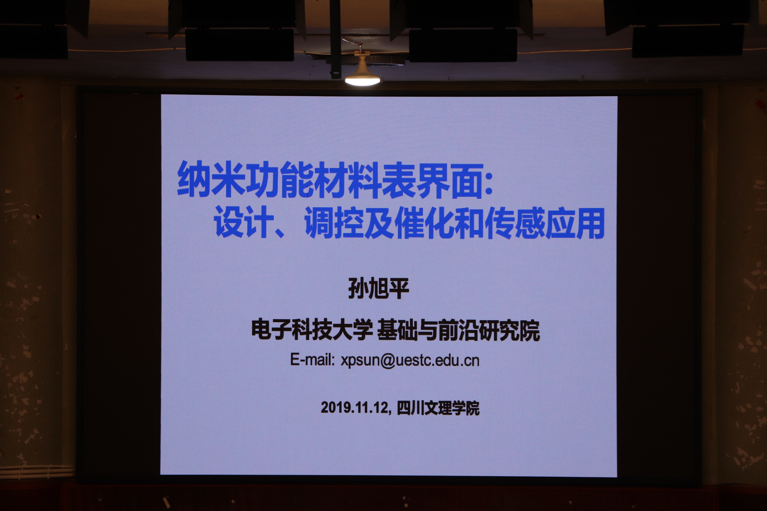 应四川文理学院LETOU国际米兰官网邀请,电子科技大学基础与前沿研究院孙旭平教授于2019年11月12日到访LETOU国际米兰官网并进行学术交流。晚上19:00孙旭平教授在南坝校区学术报告厅做了“纳米功能材料表界面:设计、调控及催化和传感应用”的专题报告。LETOU国际米兰官网党总支书记朱朝菊,副院长邓祥及LETOU国际米兰官网300余名师生代表聆听报告会。报告会由LETOU国际米兰官网院长刘长路主持。
