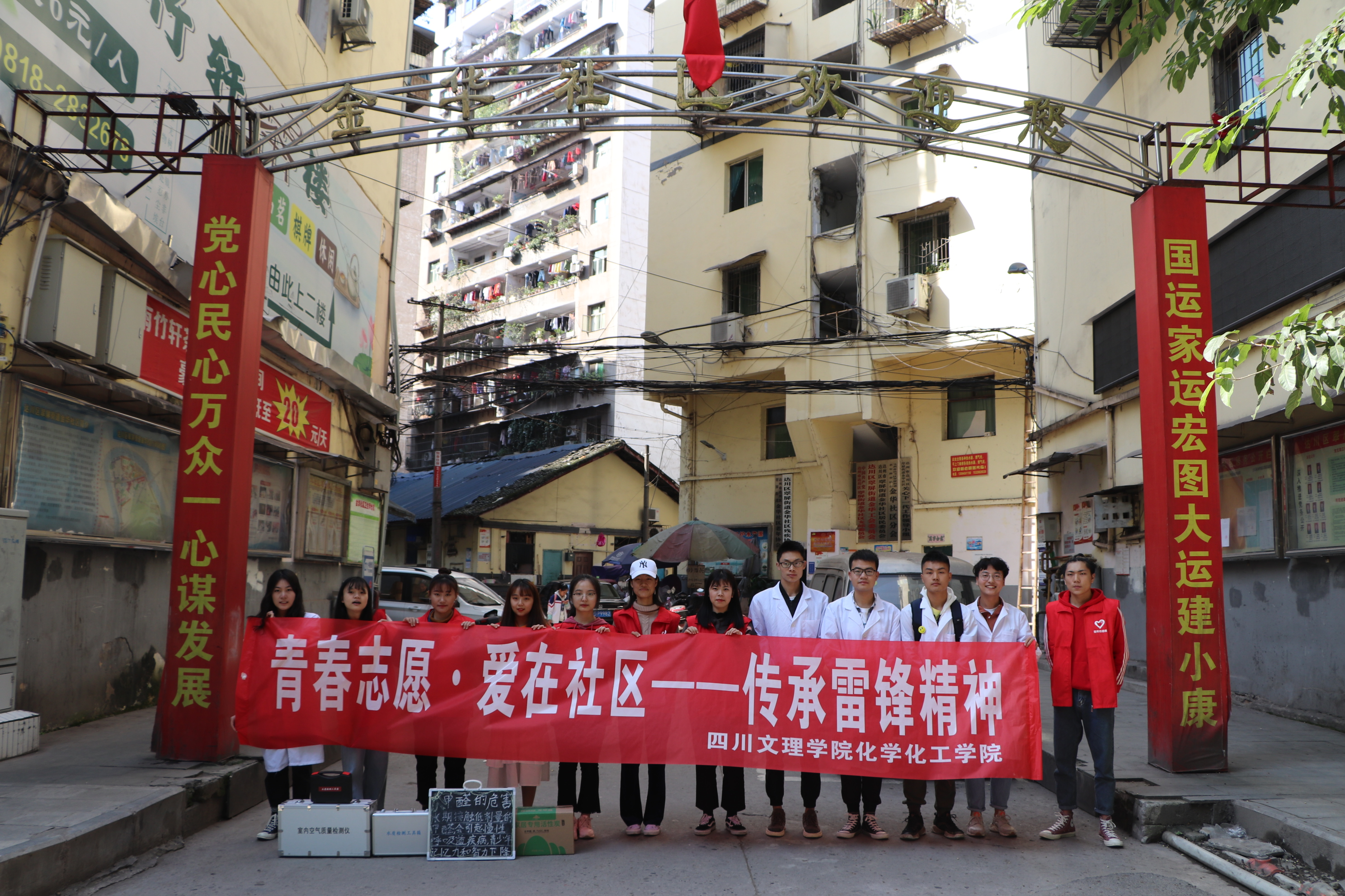 11月3日下午1点50分,青年志愿者们于四川文理学院南坝校区门口集合,仔细认真地检查相关仪器是否完备,并按照事先分配好的小组,组织好队列,随后在义务服务活动相关工作人员的带领下前往金华社区。到达活动地点后,各小组分工明确,有序地开展各自的工作。宣传小组的成员们向社区居民宣传此次检测活动及意义,同时其他志愿者对社区居民进行雷锋精神的宣讲与普及。义务服务活动相关的工作人员为社区居民进行空气质量、水质检测,并对已检测居民的检测结果进行详细的登记,以便为检测超标的用户提供改善方案并进行后期跟踪及对问题是否解决历史进行反馈。