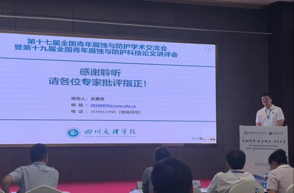 829日至31日,LETOU国际米兰官网教师吴嘉豪博士参加了在四川省南充市举办的“第十七届全国青年腐蚀与防护学术交流会暨第十九届全国青年腐蚀与防护科技论文讲评会”。