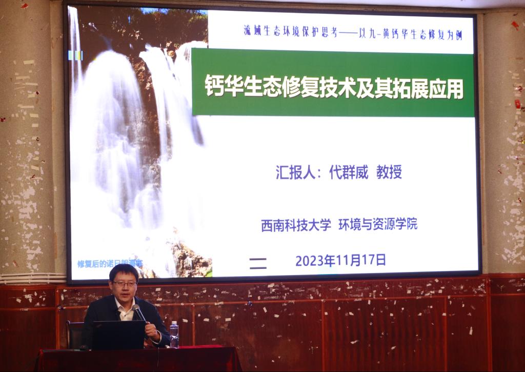 代教授以第九次全国生态环境保护大会为背景,结合习总书记全面总结新时代生态文明建设取得的“四个重大转变”巨大成就,深刻阐述了新征程下我国继续推进生态文明建设需要处理好的“五个重大关系”,以“九-黄钙华生态修复”为具体案例,结合流域生态环境保护具体举措,系统介绍了什么是钙华,钙华在生态修复方面的研究方法及对生态保护的现实意义,为师生带来了一场精彩的学术讲座。在讲座最后,代群威教授还对在场师生提出的问题进行了一一解答。