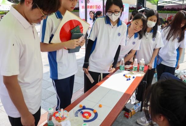 同学们体验北京奥运会时空点桌面冰壶游戏