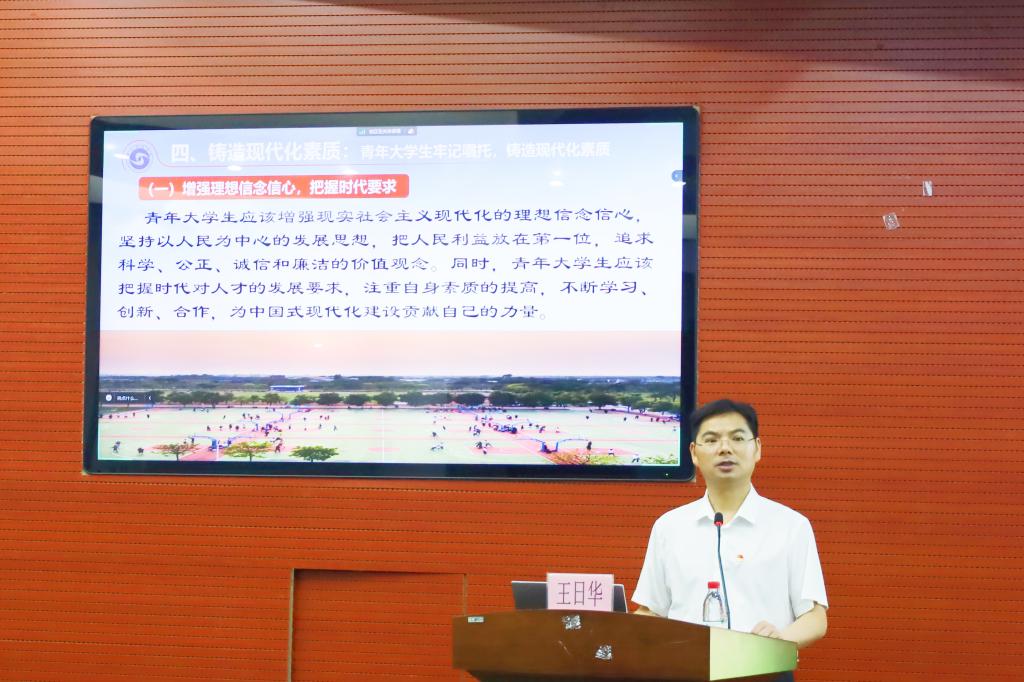 王日华校长以《中国式现代化的推进与青年大学生的现代化素质铸造》为主题,结合习近平总书记关于中国式现代化的系列重要论述与党的二十大报告内容,分别从读懂中国式现代化、开启中国式现代化、推进中国式现代化、铸造现代化素质四个方面与大家交流分享。