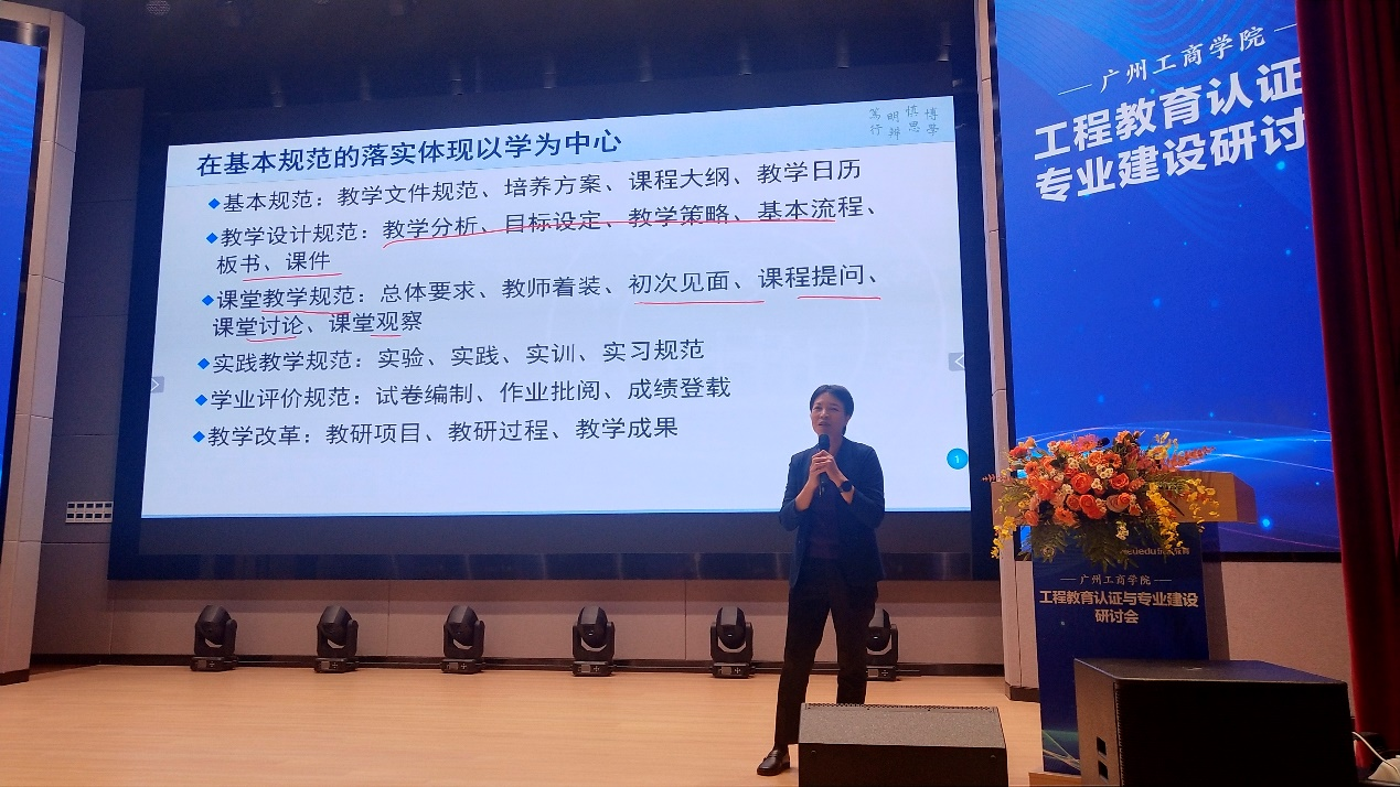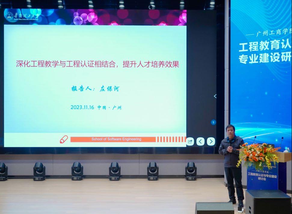 会上,两位受邀专家教授围绕工程教育主题分别进行主题报告。11月16日下午,中国工程认证协会认证专家、教育部软件工程专业教学指导委员会委员左保河教授发表了以《深化工程教学与工程认证相结合,提升人才培养效果》为主题的报告分享。左保河教授指出,专业特色决定了人才培养特色,学校和各专业应构建特色鲜明的人才培养模式,并从工程教育专业认证的重要性、申报流程、实践经验等方面进行了深入探讨。