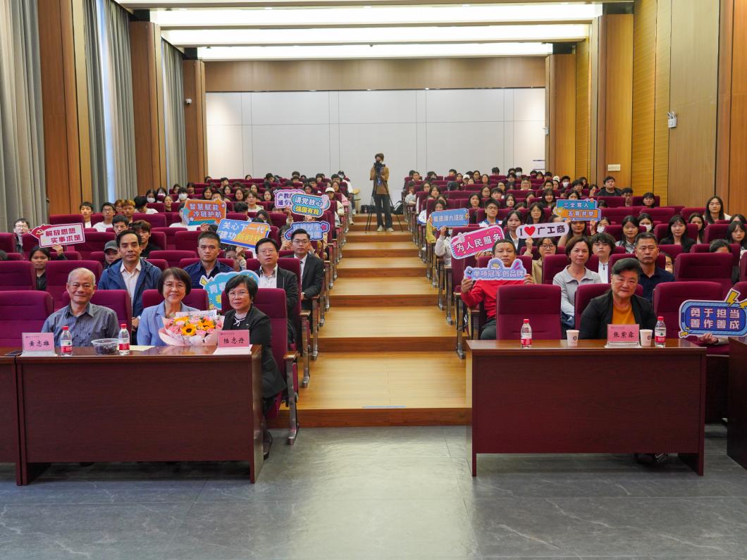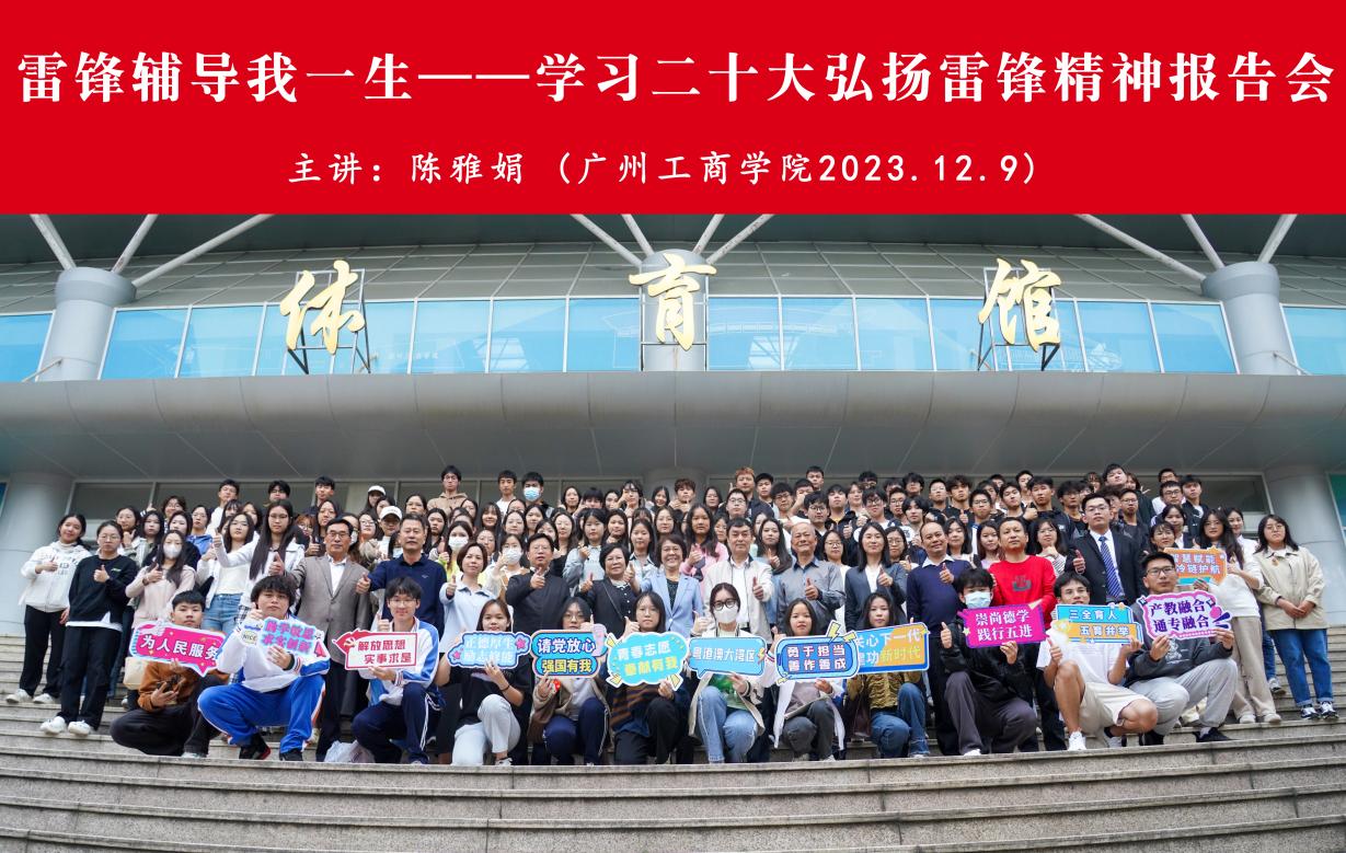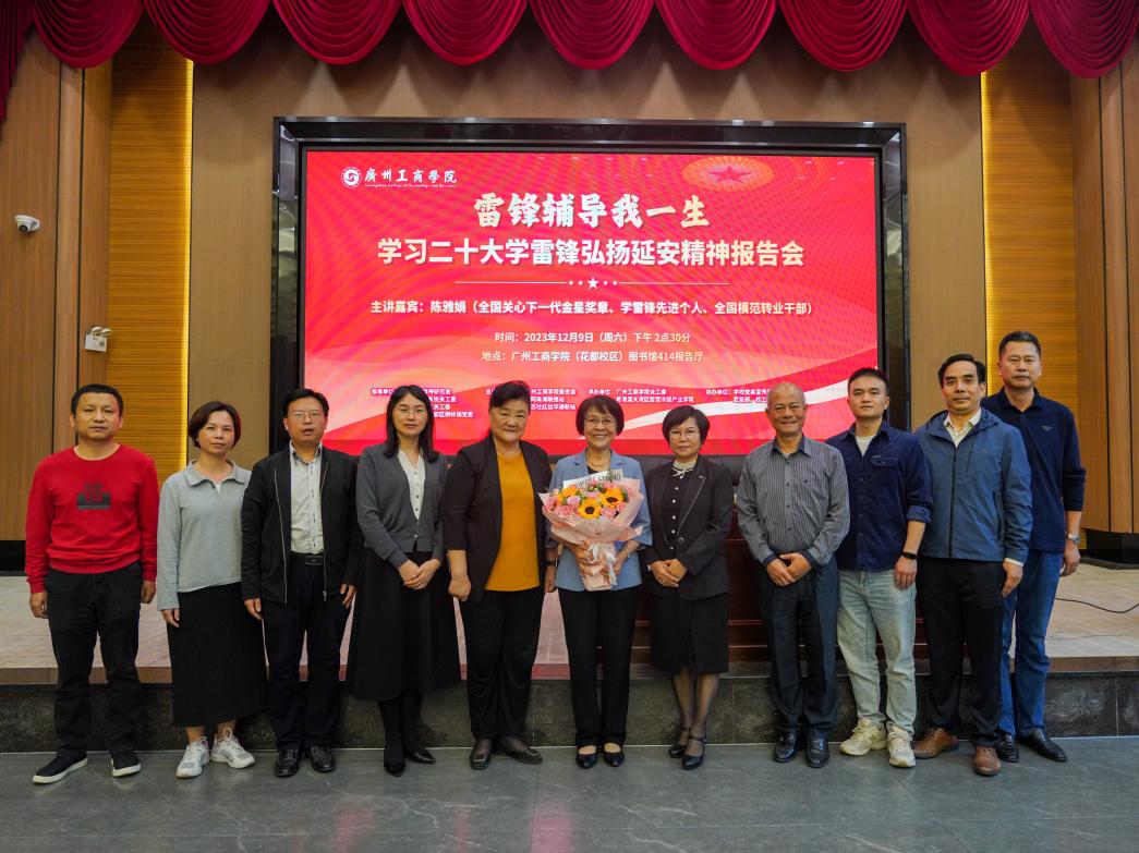 全国关心下一代金星奖章、学雷锋先进个人、全国模范转业干部陈雅娟,雷锋杂志社红丝华通联工委刘钢,广东省教育系统关工委常务副主任张紫露,广州市花都区关工委常务副主任黄金来、罗婷,佛山市三水区关工委副主任黄志雄,花都区狮岭镇综合行政执法办公室主任、大队长卢国平等嘉宾和学校领导,学工部、武装部等部门负责人,校关工委委员、校外导师、各学院师生代表等参加报告会。