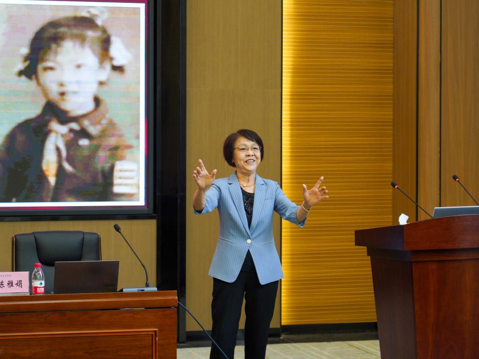 她现场带领全体师生合唱《学习雷锋好榜样》,通过大量的珍贵照片,从结识雷锋、学习雷锋和宣传雷锋三方面展开,分享了与雷锋近距离接触的往事,数十年来身体力行传承雷锋精神。不论是在部队上,还是在地方上,陈雅娟一直都选择最艰难的活儿干,并介绍了几个经典案例:1969年她主动请缨,参加珍宝岛自卫反击战,担任前线总指挥所话务员;当年条件艰苦,为了养好20头猪,不惜自己亲身舔嚼不断调整配比;转业后为了国家利益挺身而出、秉公查处非法经营,不惧歹徒威胁,匡正市场风气。她以自身的奋斗经历,诠释了雷锋精神的深刻内涵。情到深处,她流下了激动的泪水,一句“我为人人,人人为我”,使所有人都被深深感动。