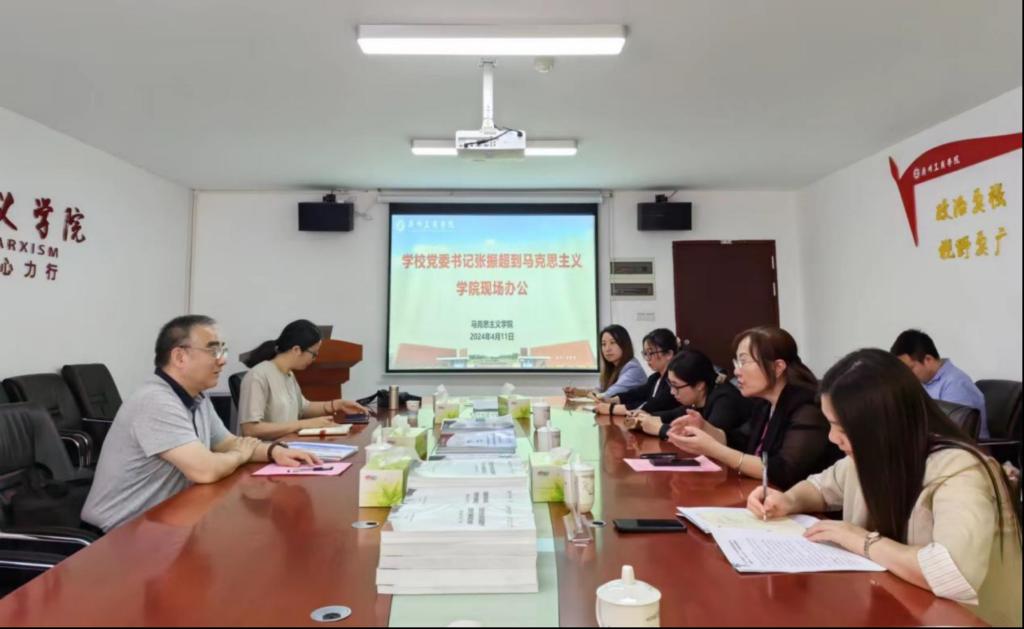 【本网讯】为深入学习习近平新时代中国特色社会主义思想,贯彻落实高校党委的思政课建设主体责任,4月11日下午,学校党委书记张振超一行到马克思主义学院召开现场办公会,并对学院的建设发展情况进行深入调研和指导。校党委办公室相关负责人出席了本次会议,马克思主义学院党政领导班子、教研室主任代表参会。
