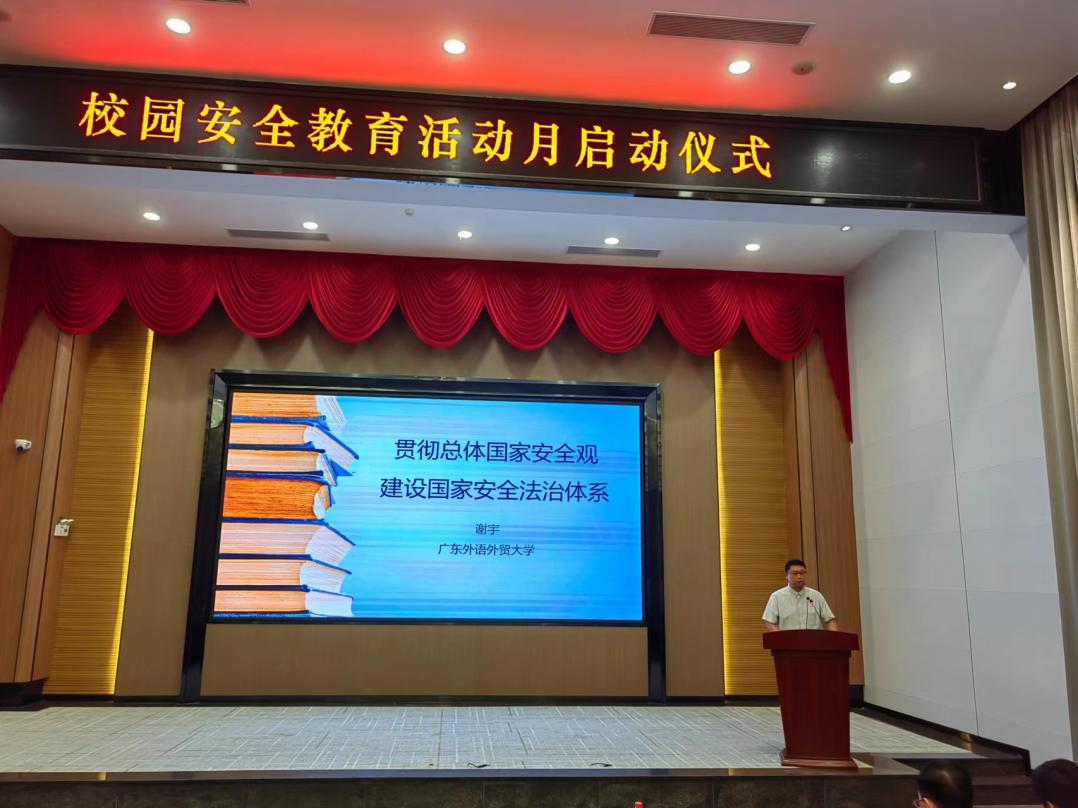 【本网讯】4月17日晚,学校在花都校区图书馆414报告厅举办2024年校园安全教育活动月启动仪式,并诚邀广东外语外贸大学谢宇博士开展题为“贯彻总体国家安全观 建设国家安全法治体系”的专题学术讲座。学校党委副书记、纪委书记、副校长朱特威、宣传部、学生处、人事处、后勤处、保卫处、团委负责人以及各二级学院分管学生工作副院长参加了本次活动。