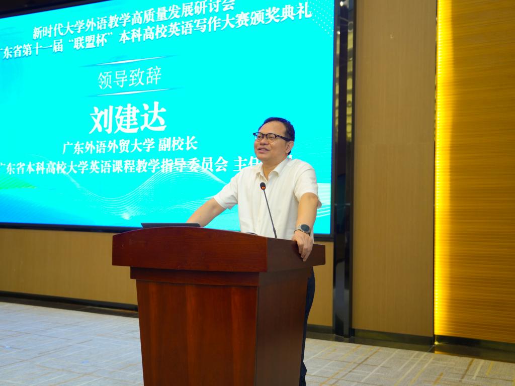教育部高等学校大学外语教学指导委员会副主任委员,广东外语外贸大学副校长刘建达教授随后致辞。他首先向承办此次研讨会的学校及单位表示衷心的感谢。他指出,随着科技的不断进步和创新,新质生产力在外语教育中的应用正改变着传统的教育模式,大学外语教育者要深入学习领会习近平总书记关于发展新质生产力的重要论述精神,扎实做好教育改革、科技创新、人才培养工作,实现教学高质量发展。