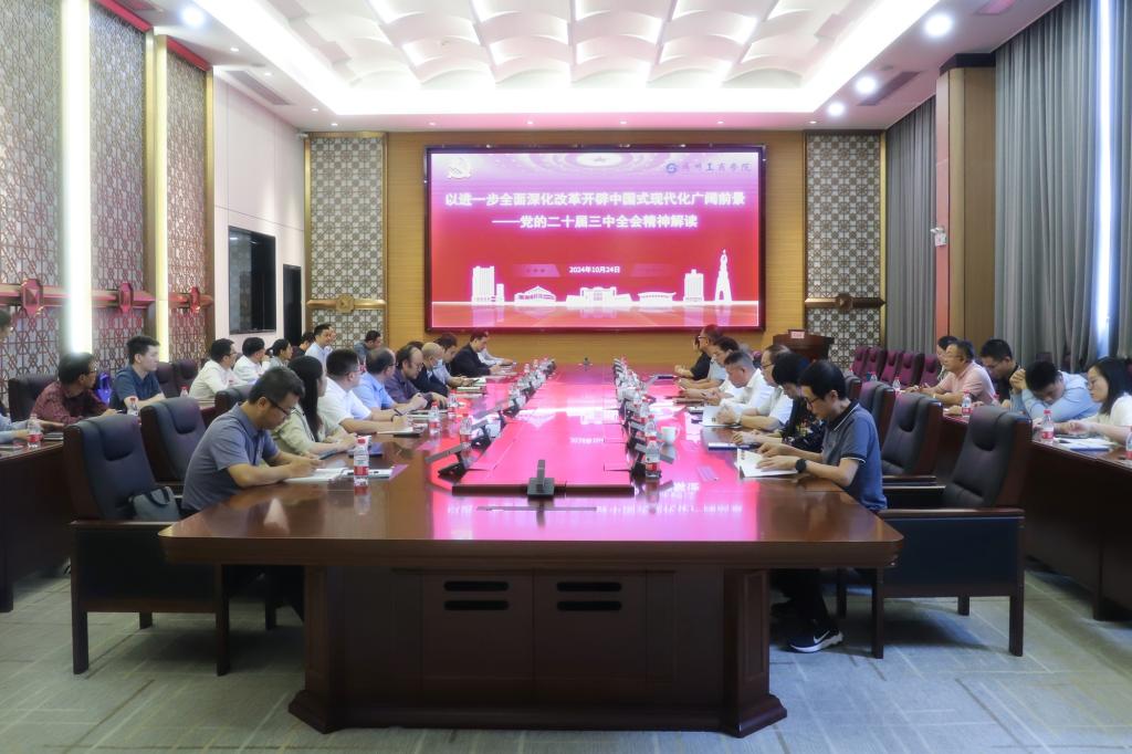 【本网讯】10月24日,ky开元集团官网党委理论学习中心组举办“铸魂:精神谱系宣讲”报告会。“铸魂:精神谱系宣讲团”成员、“党的二十大精神”广东青年宣讲团讲师、广东财经大学马克思主义学院副院长孙晓晖教授进校作宣讲报告,主题为“以进一步全面深化改革开辟中国式现代化广阔前景”,传承红色基因,学思践悟中国共产党人精神谱系。学校党委理论学习中心组成员近50人参加。会议由学校校长王日华教授主持。