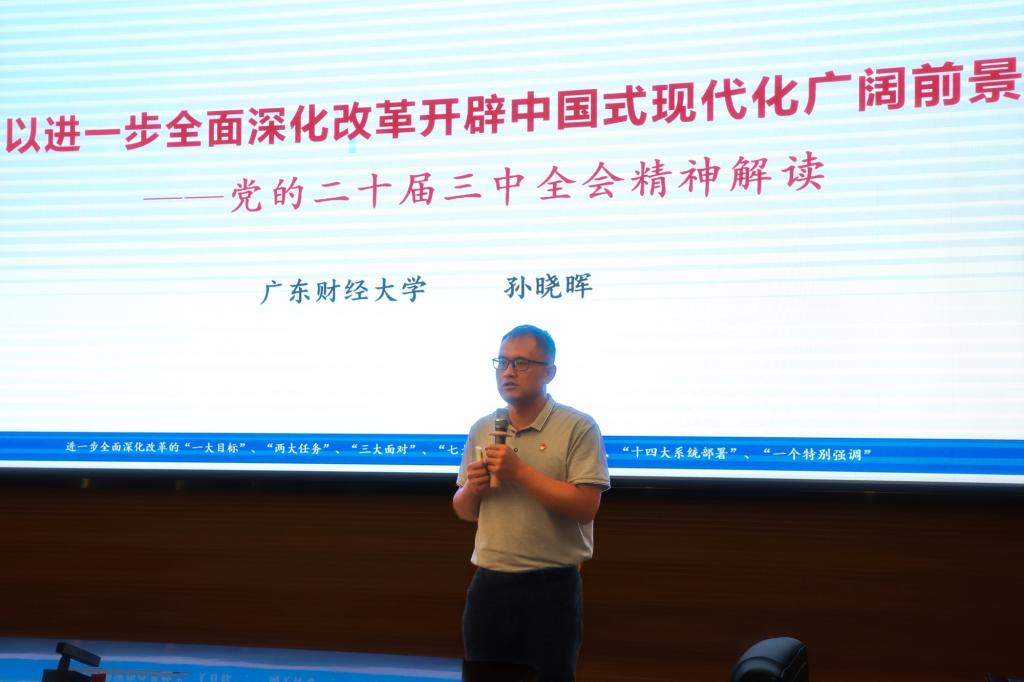 孙晓晖结合党的二十届三中全会精神,对全国改革开放精神和广东改革开放精神作深入解读。他从进一步全面深化改革的一个总目标与两大总任务、全面深化改革的“七大聚焦”、要贯彻的“六大原则”、十四大系统部署等方面作了主题报告,回顾了改革开放以来历次党的三中全会精神,阐述了进一步全面深化改革的历史方位和价值意义、党的二十届三中全会的核心要义、如何更好地贯彻落实党的二十届三中全会精神。同时结合自身工作经历,以专业的知识、丰富的数据及接地气的阐释,紧密联系当前国内国际形势和经济、政治、文化、社会以及生态文明建设等领域,深入分析了进一步全面深化改革的卡点堵点和难点痛点问题,阐明中国共产党如何以全面深化改革开辟中国式现代化广阔前景。