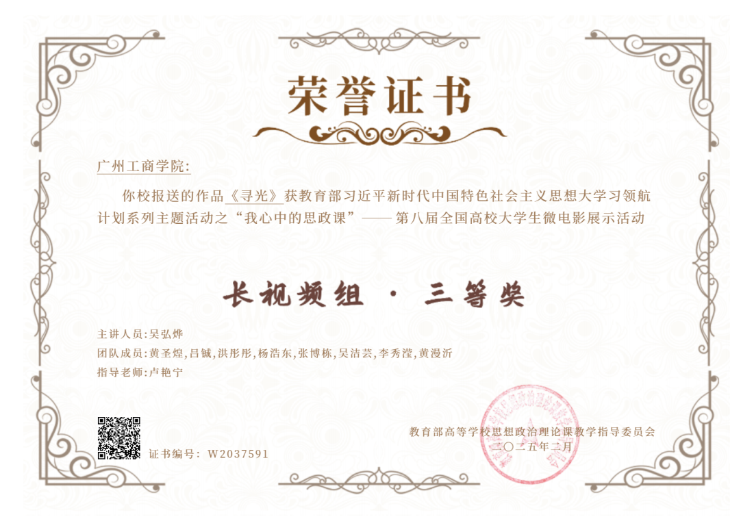 【本网讯】近日,教育部公布“我心中的思政课”——第八届全国高校大学生微电影展示活动评审结果,工学院学生团队(吴弘烨、黄圣煌、吕铖、杨浩东、张博栋、洪彤彤、李秀滢、吴洁芸、黄漫沂)在ky开元马克思主义学院卢艳宁老师指导下创作的微电影作品《寻光》历经自主申报、学校推荐、网上初评、专家评委复评等多个阶段,在全国1006所高校提交的3134部微电影作品中脱颖而出,荣获全国三等奖,实现了ky开元在该项赛事中的零的突破。