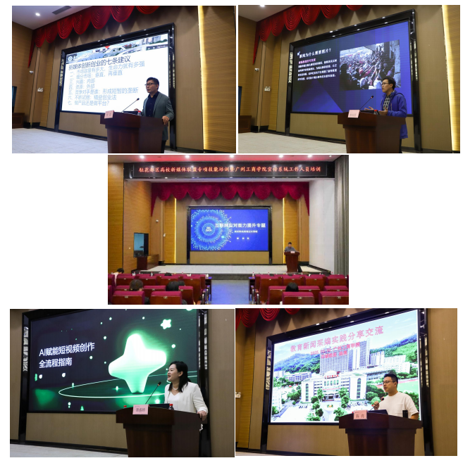 在随后的培训中,广东白云学院党委委员、宣传部部长、融媒体中心主任讲授“新媒体的认知与实践”,从认识新媒体、如何提高新媒体素养、新媒体实践探索等方面,全面深入地剖析了高校新媒体矩阵规范化运营的路径与方法。广州日报驻广州市政协编辑部摄影副主编熊灿坚主讲“新闻摄影的实战技巧与主题表达”,详细介绍了如何掌握新闻摄影理论与规律、提升专业拍摄技能、提高新闻传播效果、避免负面舆情等,对参会人员掌握运用镜头语言,讲好故事和传递价值,具有指导意义。佛山市委网信办副主任黎祥英结合其工作经验,分享了他对网络意识形态的理解、在网络风险研判与处置突发舆情的方法,为高校网络安全工作提供了指导。广东广视数字科技有限公司副总经理谭盛婷以“AI赋能短视频创作全流程”为主题开展讲座,系统讲解短视频定义、内容策划、AI工具应用、后期优化与发布等内容,为参训学员提供了可直接落地的操作方案。广州羊城晚报资深记者陈亮以其深厚的专业功底和丰富的从业经历,梳理了新媒体新闻写作、策划、采访等技能的核心与方法。