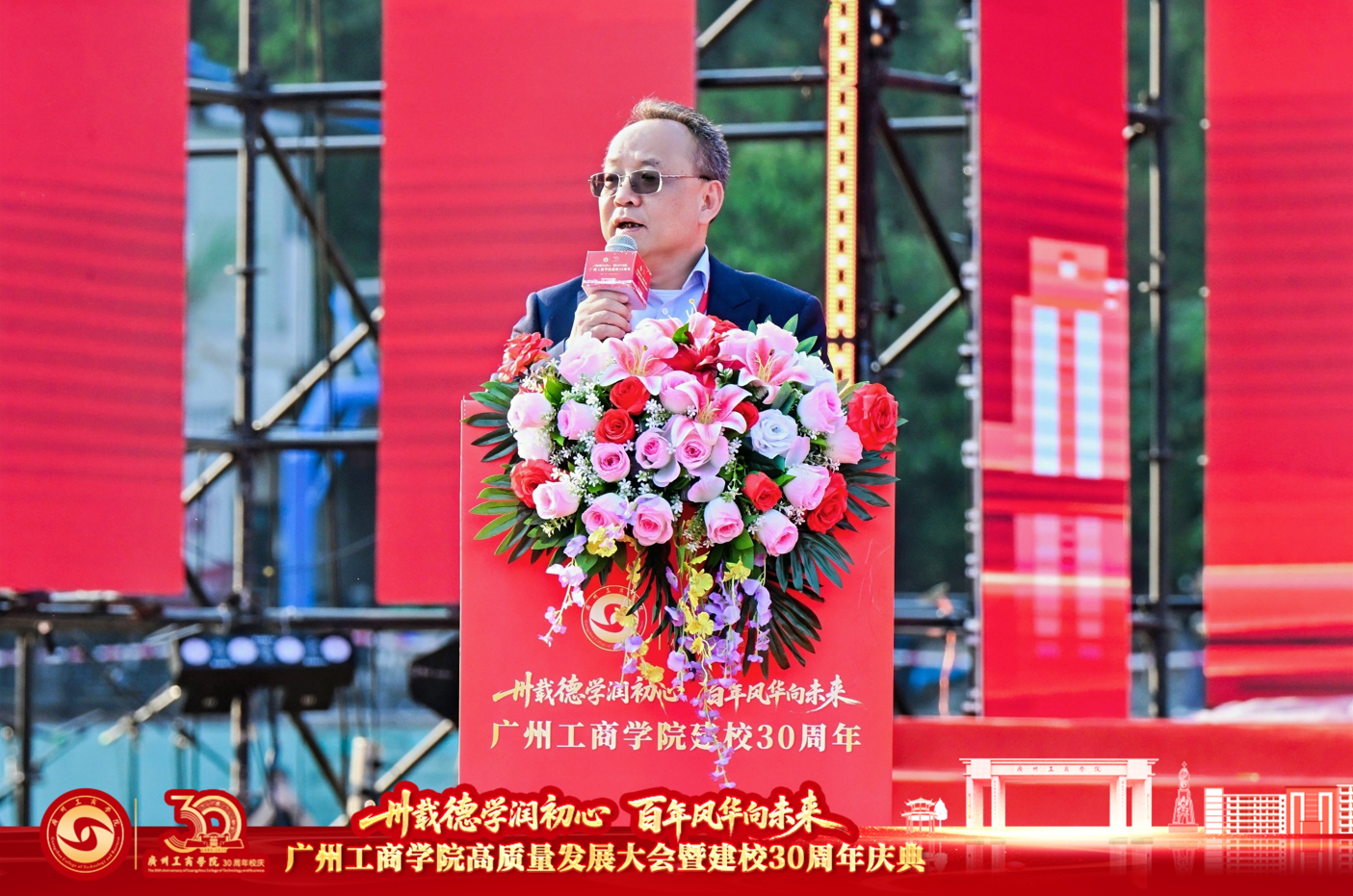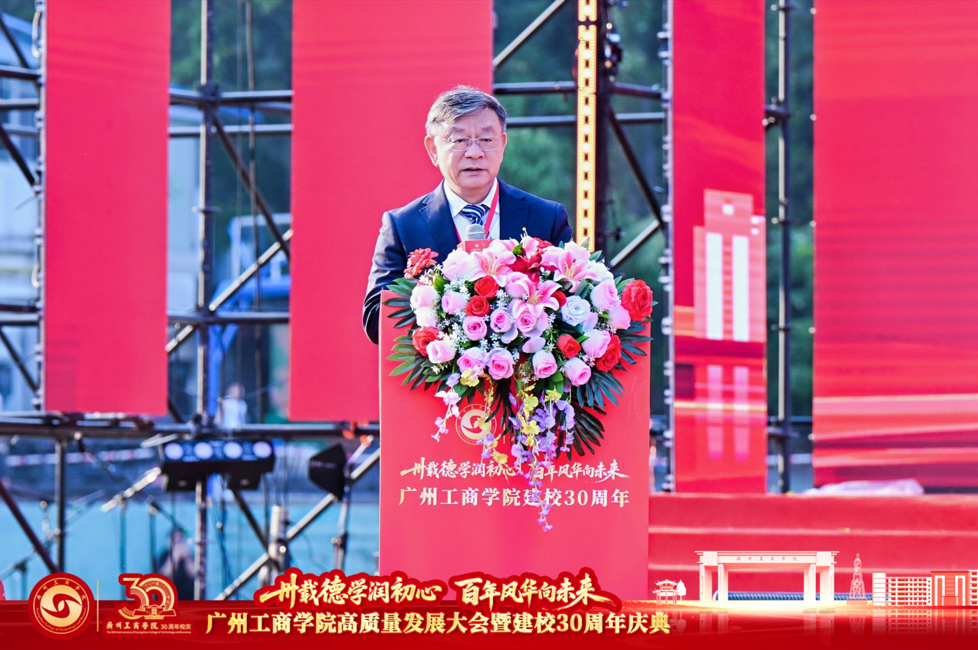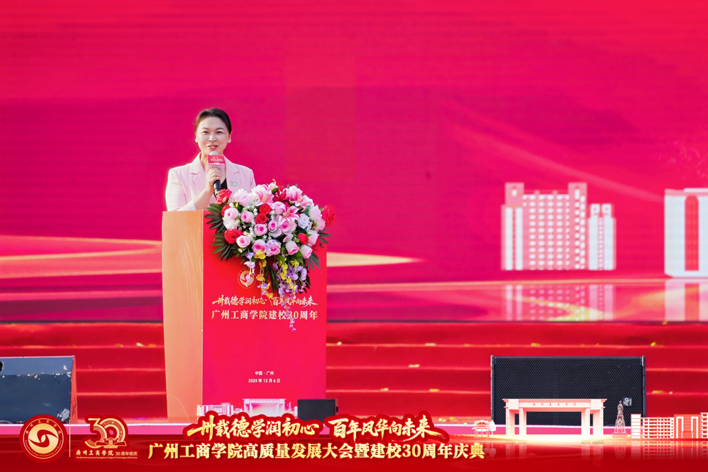鲁朝云教授作为教师代表发言,她分享了自己躬耕教坛十七载的成长故事,诠释了学校“以质立校、以生为本、突出特色、崇尚创新”的理念如何滋养每一位教师。“从初登讲台的忐忑,到主参编6部教材;从指导竞赛首次获奖,到与团队共获广东省教学成果一等奖……我的每一步成长都烙印着学校发展的足迹。”她代表全体教师许下“三重礼”的庄重承诺:以初心铸魂育人、以深耕踔厉创新、以传承甘为人梯,为母校下一个三十年积蓄磅礴力量。
