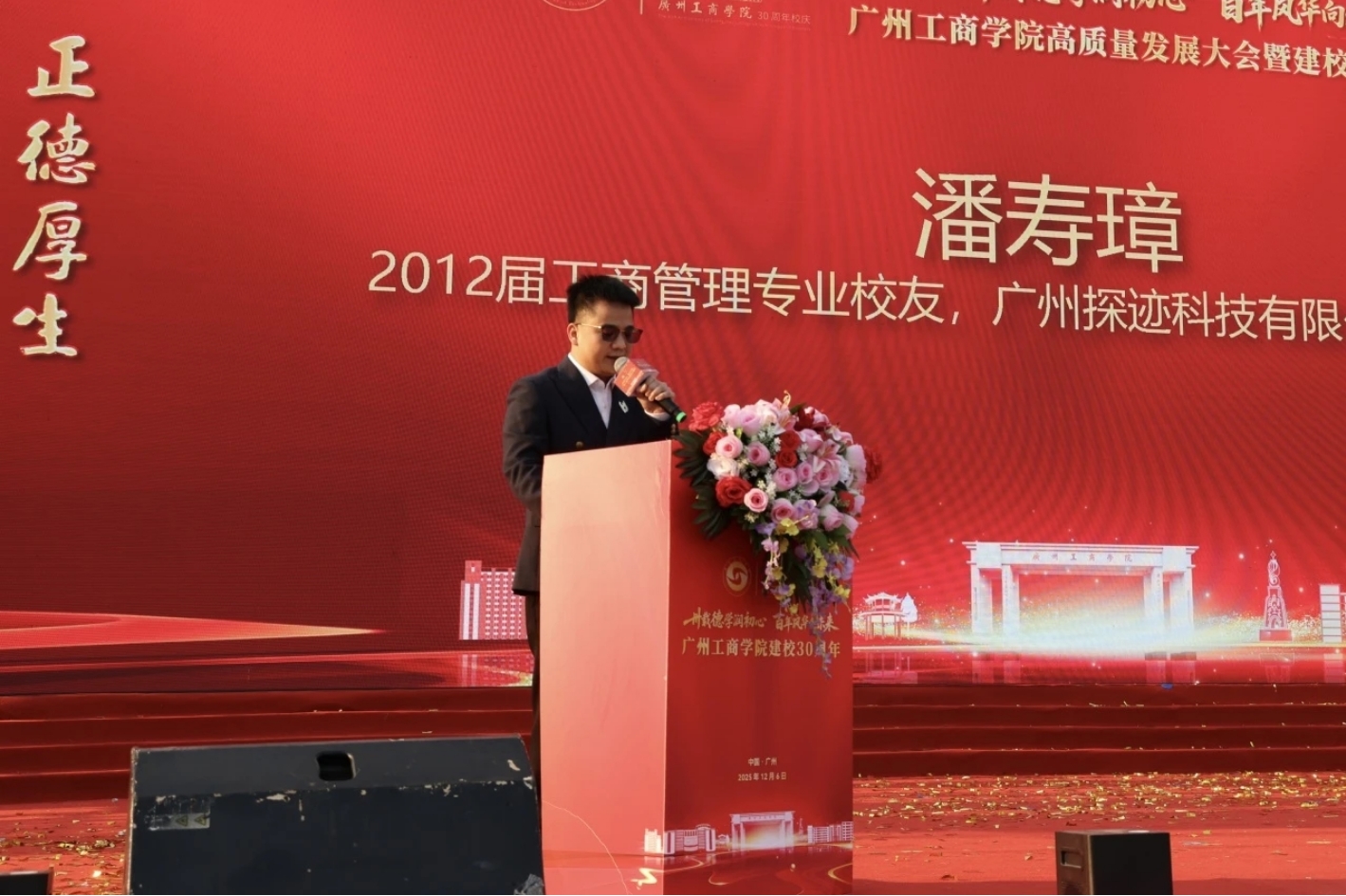 校友代表、2012届工商管理专业校友、广州探迹科技有限公司联合创始人潘寿璋分享了从母校出发的创业征程。他将创业成功归因于母校的栽培。为回馈母校,他自2016年起设立奖教奖学基金,至今已惠及师生300余人次。“离开母校至今虽然有十三年了,但我始终时刻关注着母校的发展。”他动情地说:“作为校友,我们将永远做母校最坚定的支持者和最热情的啦啦队,时刻准备着为母校的发展贡献自己的力量。”