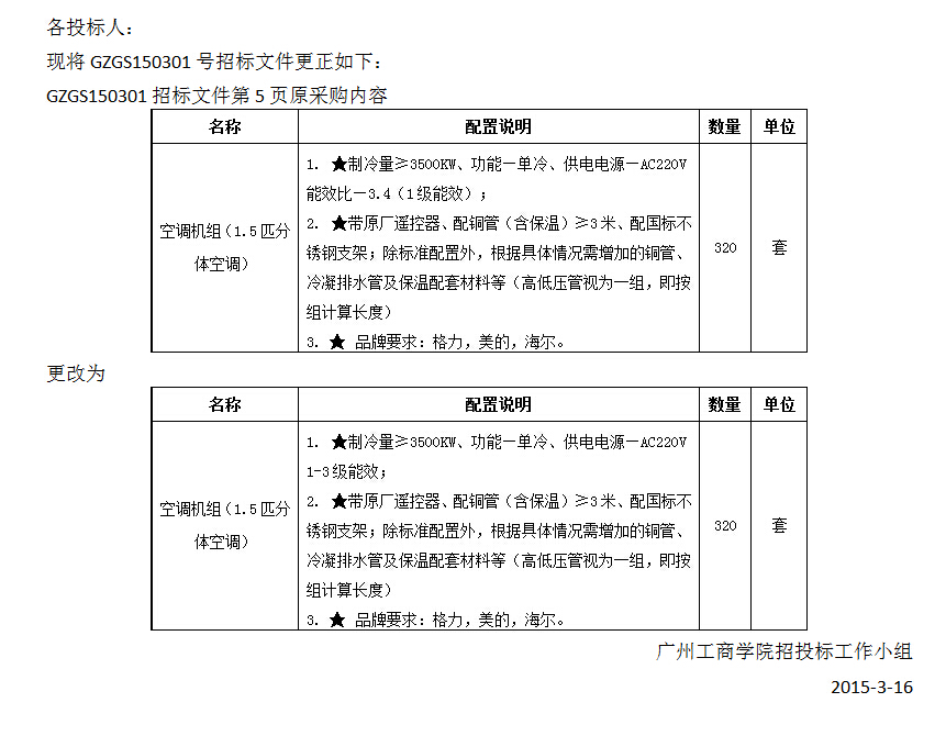 关于花都校区北区学生公寓1、5、6栋分体空调采购项目(GZGS150301号)招标文件更正的通知