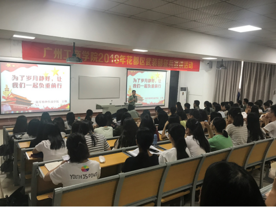 【本网讯】6月7日,学校联合花都区武装部在教学楼417组织了一场征兵动员宣传讲座,并于讲座结束后在教学楼一楼大堂进行了征兵现场报名咨询。中国人民解放军特种作战学院学生军训教研室副主任王锋副教授、花都区武装部王晓华科长及学院武装部、学生处等相关负责人参加了此次宣传活动。