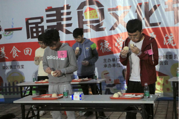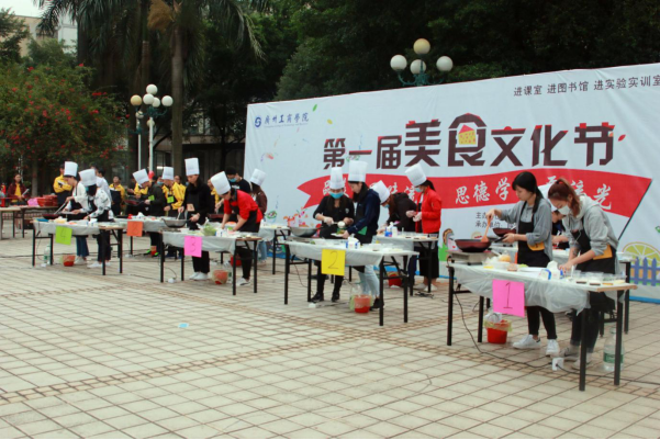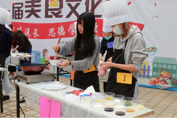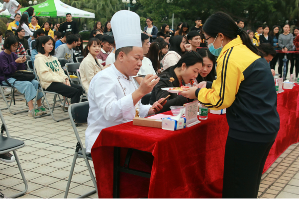 【本网讯】2017年11月30号下午,ky开元集团官网第一届“品美食回味流长,思德学积厚流光”美食文化节于花都校区文化广场如期举行。活动邀请了学院团委严晓君老师、基础教学部李青老师、后勤郑建艇老师、继续教育与培训学院团委许鹏程老师和学校饭堂黄洪师傅等担任评委。本次美食文化节由共青团ky开元集团官网委员会主办、院学生会自律委员会承办,设有“厨艺大比拼”和“大胃王大赛”两个比赛项目,以及健康饮食文化知识问答互动环节。比赛过程中还穿插了院学生会、社团联合会带来的精彩表演。“厨艺大比拼”的选手分为八个小组,依序进行“指定菜”和“自选菜”两个环节的厨艺考察以及饮食文化知识竞赛,综合得分最高者为优胜组;在“大胃王大赛”中,男子组、女子组先后进行比拼,用时最少者获胜。经过激烈的比拼,最终获得厨艺大比拼一等奖、二等奖、三等奖的分别是第八组、第七组、第一组,获得“最佳吃货”奖的分别是男子组2号选手和女子组的8号选手。