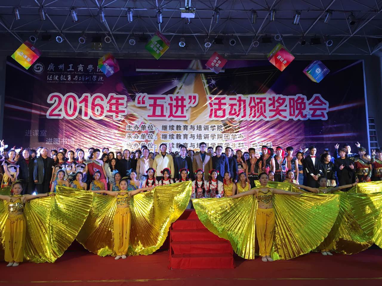 【本网讯】为积极践行邝邦洪院长的“五进”(进课室、进图书馆、 进实验实训室、进体育场馆、进社会)要求,由继续教育与培训学院主办的一年一度的“五进”活动颁奖晚会于11月17日晚花都体育馆隆重举行。继续教育与培训学院常务院长陈武、副院长黄喆诚、督导陈斯城以及各科室负责人、师生代表1000余人参加了了本次晚会。