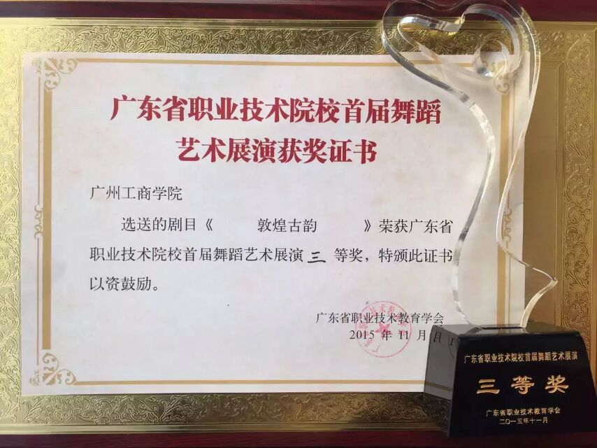 11月29日,广东省职业院校首届舞蹈展演活动中传来了捷报:音乐系选送的原创舞蹈《敦煌古韵》获得了三等奖,同时我院在本次活动中也获得了优秀组织奖。