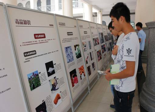 为深入贯彻习近平总书记等中央领导同志对禁毒工作的指示精神,进一步增强大学生毒品预防教育的针对性和实效性,切实提高青少年学生识毒、防毒、剧毒意识和能力,我院协同广州市流动禁毒教育馆、花都区禁毒办开展2015年大学生毒品预防教育展。活动当天,由广州市流动禁毒教育馆提供的28个禁毒宣传栏和12种仿真毒品展览品在花都校区教学楼一楼大厅展出,吸引了众多学生前去参观,同学们在展品前驻足,均被毒品带来的危害所震撼。工作人员为了帮助同学们更好地辨别各种毒品,进行详细的讲解,并派发宣传手册和宣传漫画,以让同学们了解更多关于禁毒的知识。