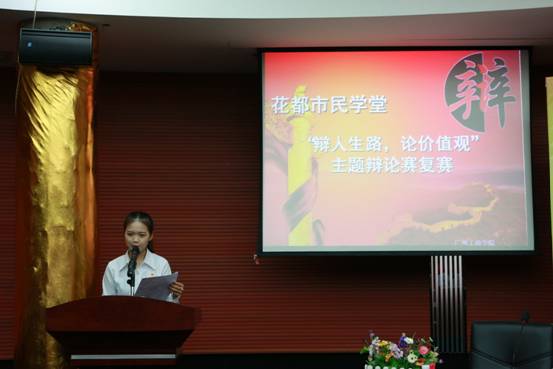 【本网讯】5月21日,广州大学市政技术学院、华南理工大学广州学院、广东培正学院及我院四所高校参加了花都市民学堂“辩人生路,论价值观”主题辩论赛复赛。复赛由原区委宣传部副部长黄小华、花都区人大办副主任陈英、花都区广播电视大学副校长余大生、团区委副书记雷达、秀全中学历史高级教师朱志斌担任评委。
