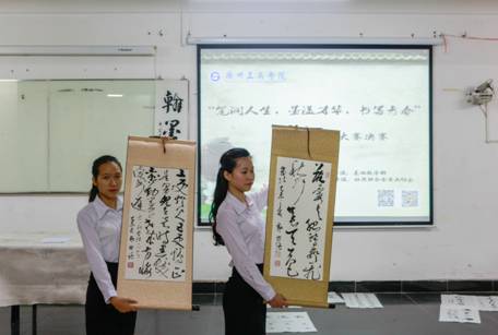 【本网讯】5月27日下午,由学院基础教学部主办,团委社团联合会书画协会承办的“笔润心智,墨溢才华,书写青春”第二届书法大赛决赛在学院花都校区教学楼417室举行。广州市书法协会理事、花都区书法家协会主席黄国强、学院书画院班澜教授、以及黄主席团队的陈可坚老师、尹哲东老师担任本次书法大赛决赛的评委,学院基础教学部主任刘晓文教授为决赛致辞。